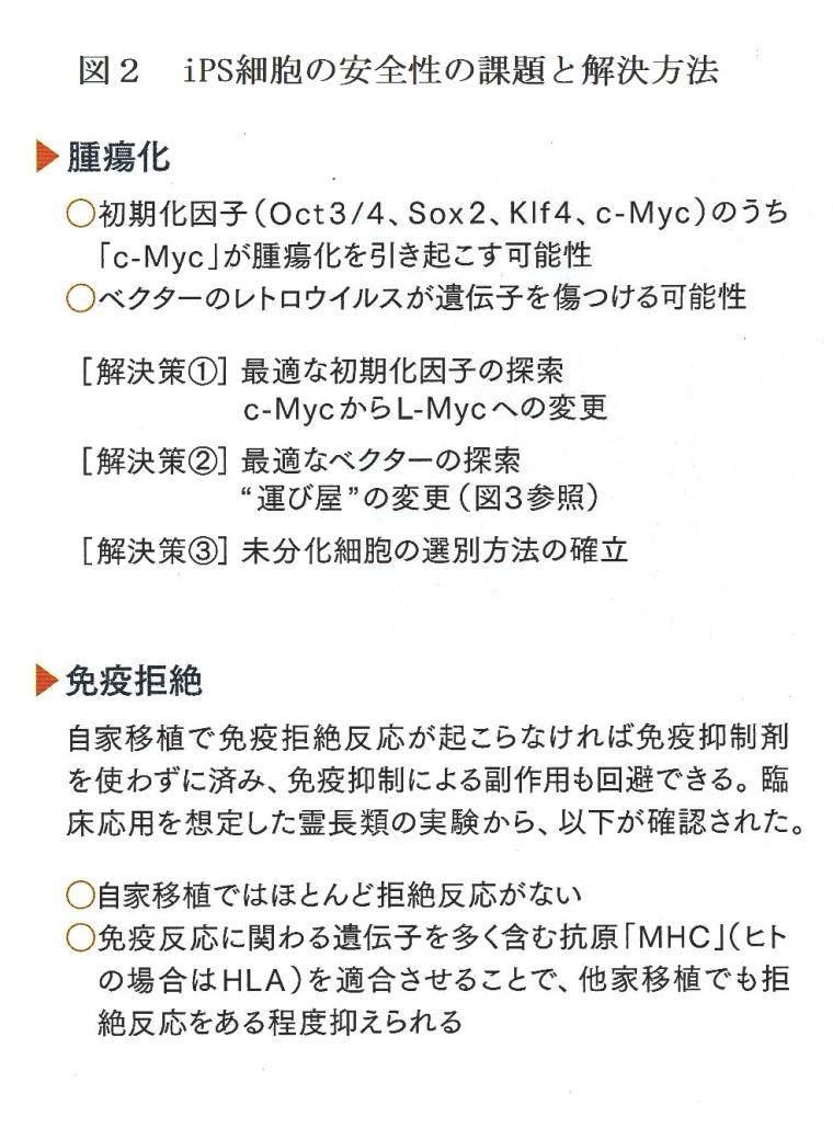 腫瘍化するもう一つの原因として、未分化細胞の残存により引き起こされる奇形種(良性腫瘍)の形成にあるようですが、移植用の細胞を確実に目的の細胞に分化させた後、未分化細胞を除去することで改善できるようです。