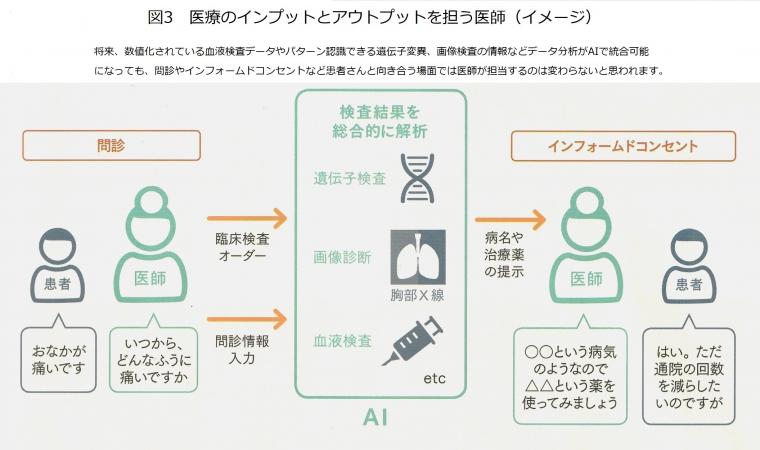図3のとおり、患者さんと直接接する医療の「出入り口」というべき問診、診断、治療方針の決定などについては、やはり「医師」が行うべきで、患者さんが治療に納得して患者さんの満足度を高めてもらうためには、AIを搭載したアンドロイド医師ではなく、患者さんの思いを汲んで、寄り添い、柔軟に対応できる生身の人間である「医師」が担当すべき分野であるということになります。